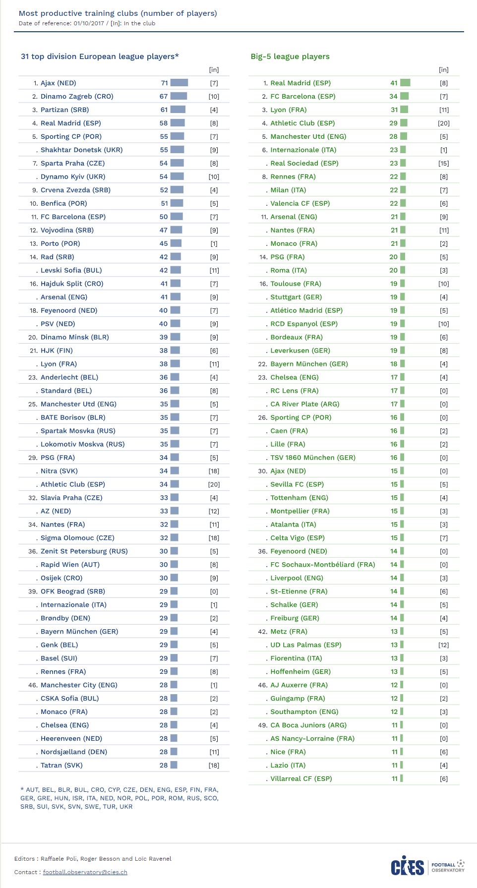 Маючи такі показники, «гірники» ділять 5-6 місце на континенті, кияни — 7-8. На першому ж голландський «Аякс»: 71 його вихованець виступає за команди елітних ліг різних Чемпіонатів Європи.