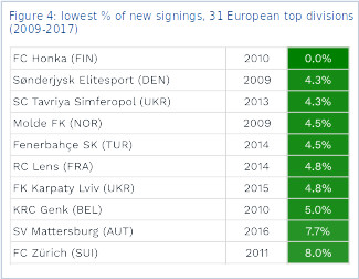 В одній із таблиць знайшлося місце двом українським командам, які потрапили до списку найстабільніших: 2013 року склад «Таврії» змінився тільки на 4,3%, а 2015-го склад «Карпат» на 4,8%.