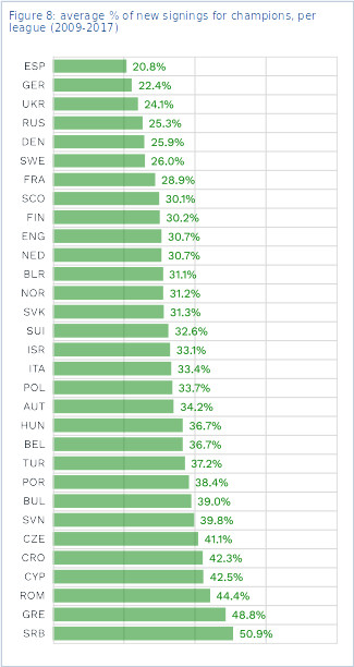 Згідно з опублікованим текстом, у зазначений період часу склади команд Чемпіонату УПЛ щорічно оновлювалися на 39,2% (тут ідеться не про заявку, а про фактичну участь футболістів у матчах). За цим показником наша Ліга одна з останніх на континенті, що, вочевидь, є позитивним сигналом, оскільки свідчить про кадрову стабільність.
