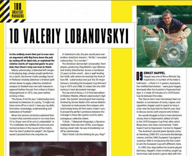 The respective register is of 100 entries. Therein we can see one Ukrainian representative - Valery Lobanovsky, whom British journalists placed on the 10th line. Also there are two coaches on the list who are directly related to Ukrainian football: Viktor Maslov (Russia) who was in charge of Dynamo, is ranked 34th, and Mircea Lucescu (Romania), the years-long coach of Shakhtar, is 87th.