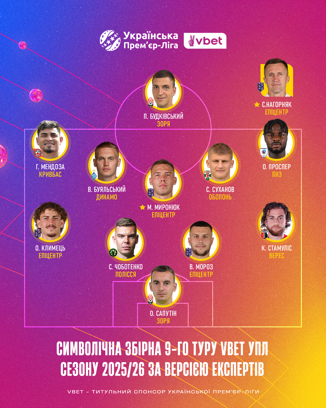 Українська Прем’єр-Ліга продовжує відзначати героїв сезону 2025/26 і склала символічну збірну 9-го туру Чемпіонату УПЛ, а також назвала найкращого гравця та найкращого тренера 9-го туру. Традиційно це було зроблено разом з ведучими, експертами, коментаторами УПЛ ТБ та представниками провідних спортивних ЗМІ України. Цього разу їх було 39.