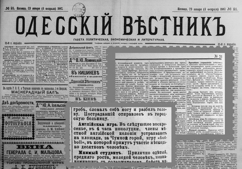 В будь-якому разі, вже з’ясовано, що слово «футбол» на території, яка входить сьогодні до складу України, вперше вигулькнуло 23 січня 1887 року — в статті газети «Одесскій вѣстникъ».