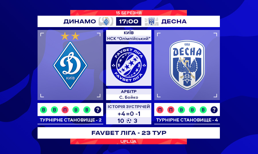 Матч 23 туру Favbet Ліги «Динамо» — «Десна»: статистичне прев’ю
