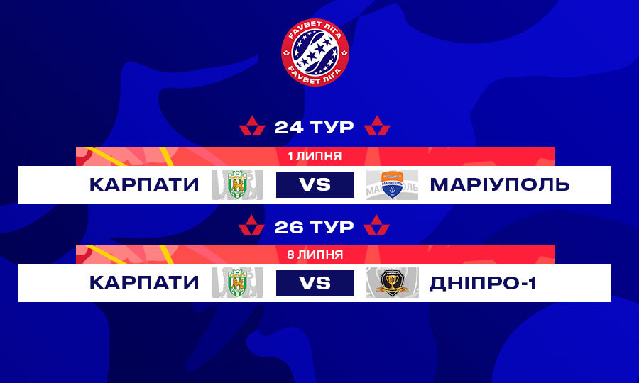— перенесений матч 24 туру Favbet Ліги «Карпати» — «Маріуполь» відбудеться в Маріуполі 1 липня (початок гри заплановано на 19:00); також нагадаємо, що, відповідно до календаря змагань, 4 липня там же, в Маріуполі, відбудеться матч 29 туру «Маріуполь» — «Карпати»;