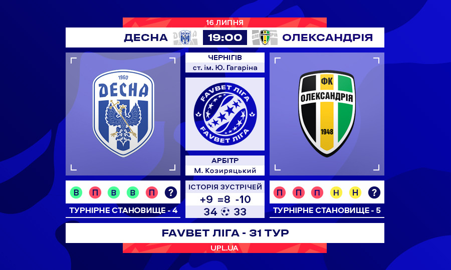 Матч 31 туру Favbet Ліги «Десна» — «Олександрія»: статистичне прев’ю