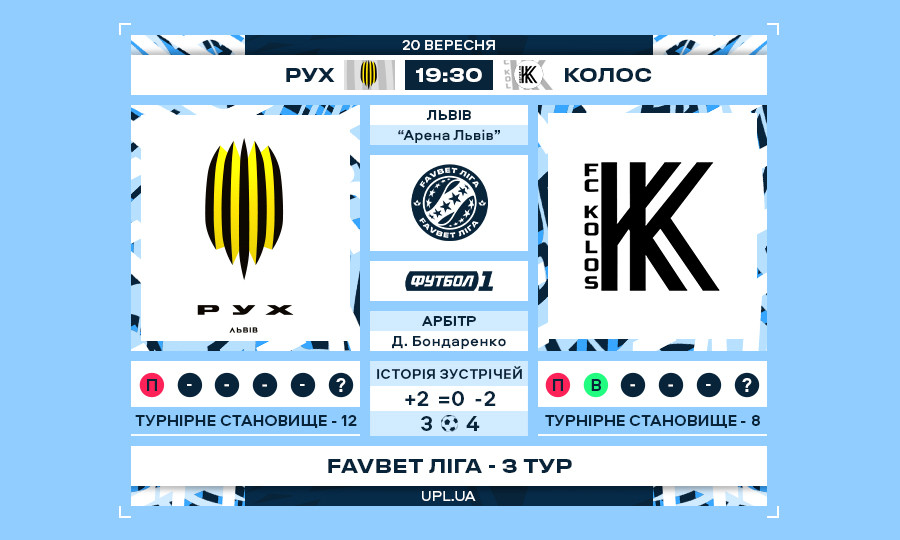 Матч 3 туру Favbet Ліги «Рух» — «Колос»: статистичне прев’ю
