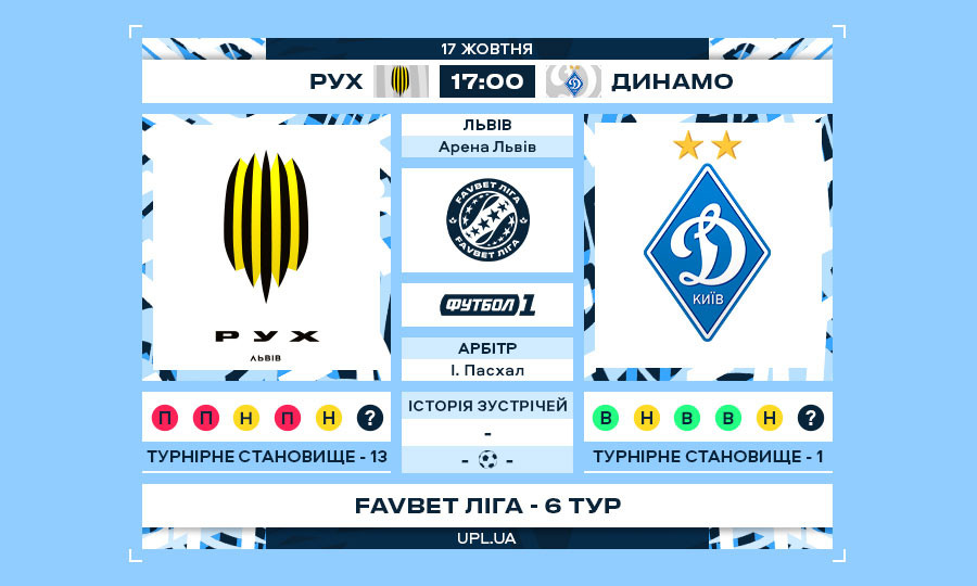 Матч 6-го туру Favbet Ліги «Рух» — «Динамо»: статистичне прев’ю