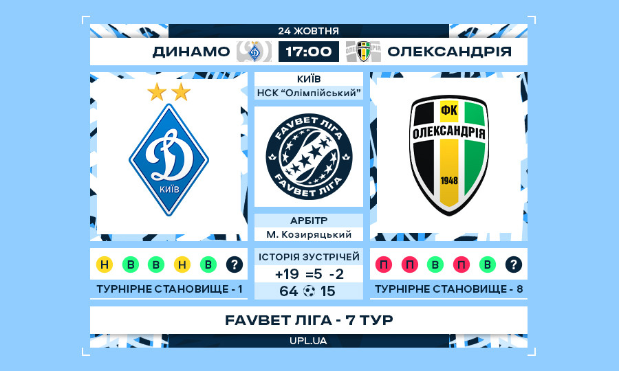 Матч 7-го туру Favbet Ліги «Динамо» — «Олександрія»: статистичне прев’ю