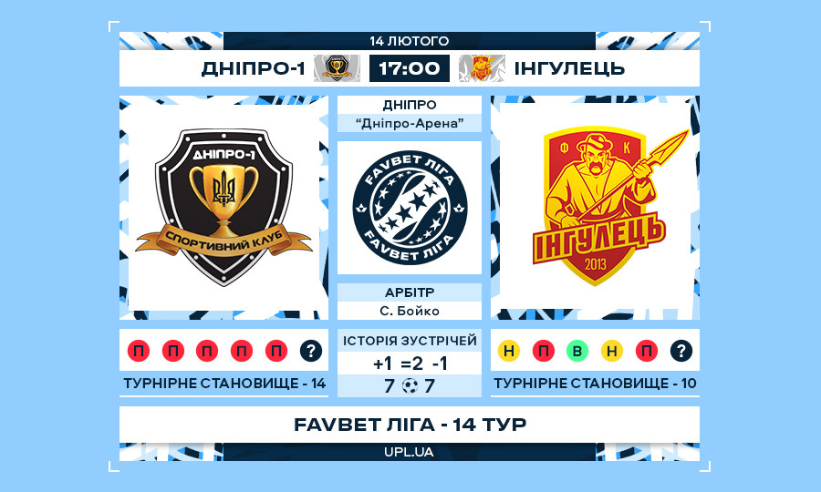Матч 14-го туру Favbet Ліги «Дніпро-1» — «Інгулець»: статистичне прев’ю