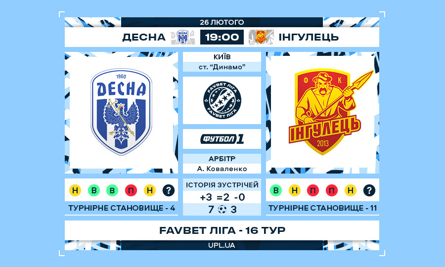 Матч 16-го туру Favbet Ліги «Десна» — «Інгулець»: статистичне прев’ю