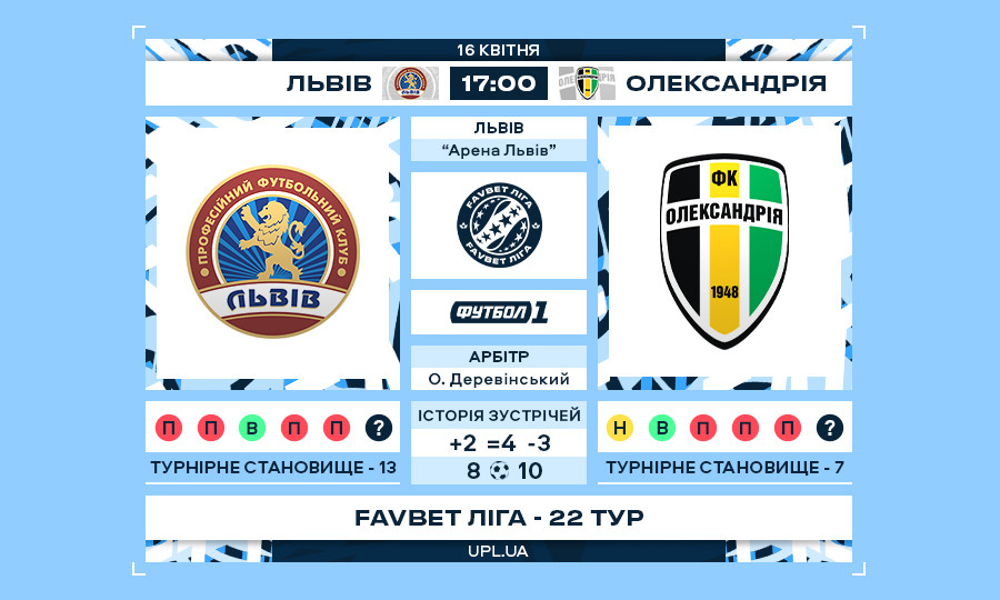 Матч 22-го туру Favbet Ліги «Львів» — «Олександрія»: статистичне прев’ю