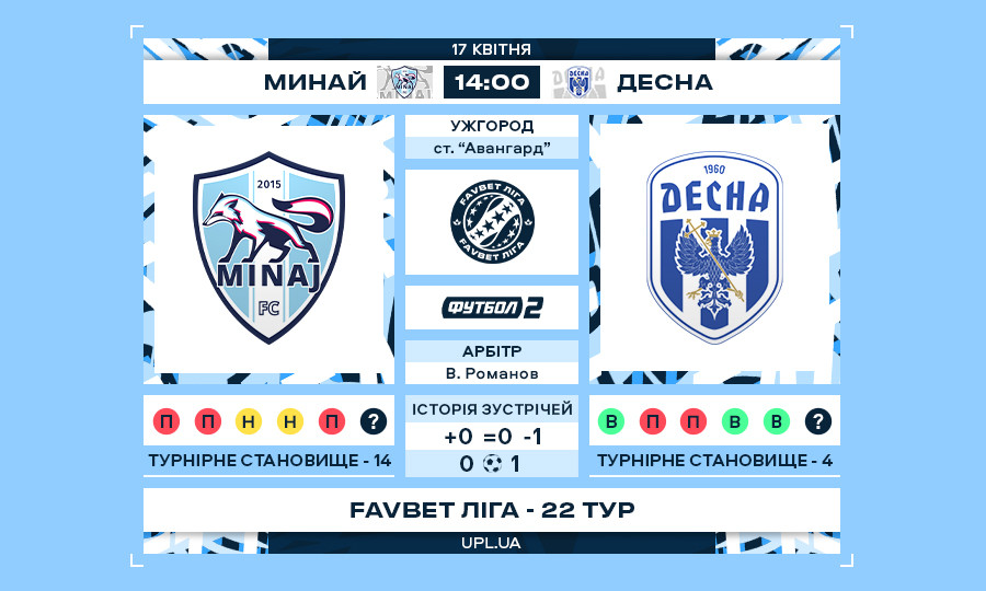 Матч 22-го туру Favbet Ліги «Минай» — «Десна»: статистичне прев’ю