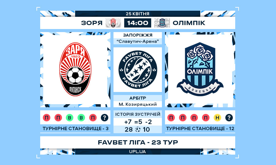 Матч 23-го туру Favbet Ліги «Зоря» — «Олімпік»: статистичне прев’ю