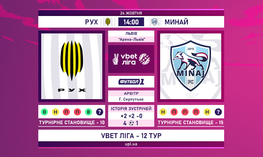 Матч 12-го туру VBET Ліги «Рух» — «Минай» статистичне прев’ю