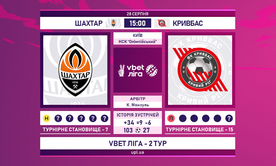 Матч 2-го туру VBET Ліги «Шахтар» — «Кривбас»: статистичне прев’ю