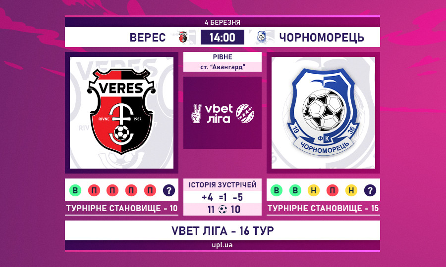 Чорноморець може зазнати загалом 290-ї поразки в УПЛ, а Верес – 20-ї на своєму полі.