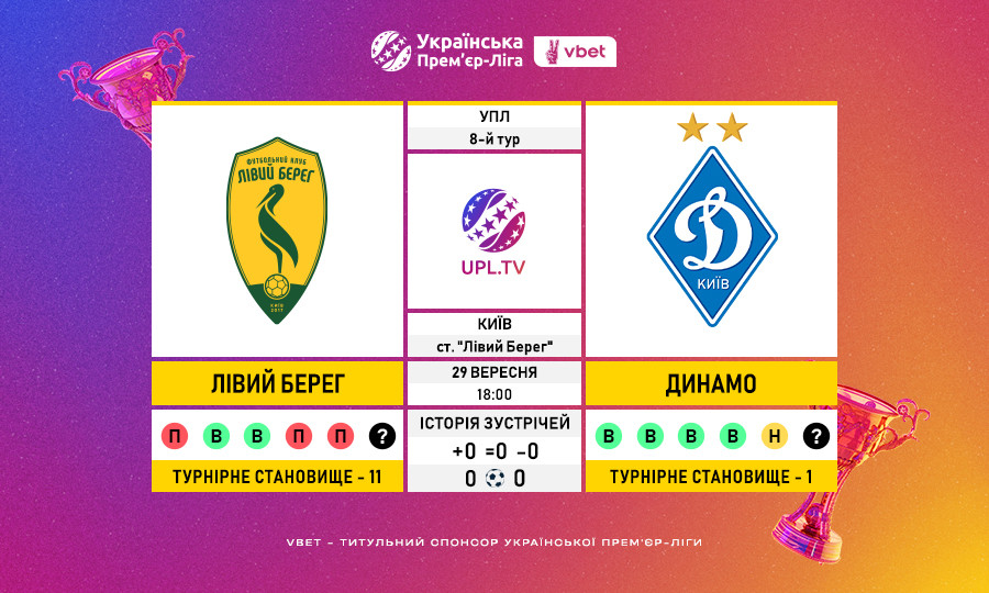 Матч 8-го туру VBET Української Прем’єр-Ліги «Лівий Берег» — «Динамо»: статистичне прев’ю