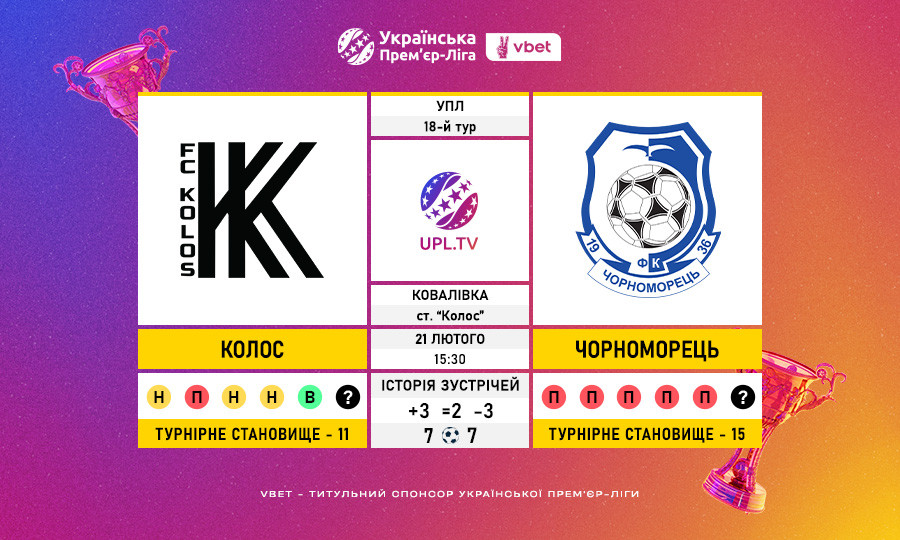 Матч 18-го туру VBET Української Прем’єр-Ліги «Колос» — «Чорноморець»: статистичне прев’ю