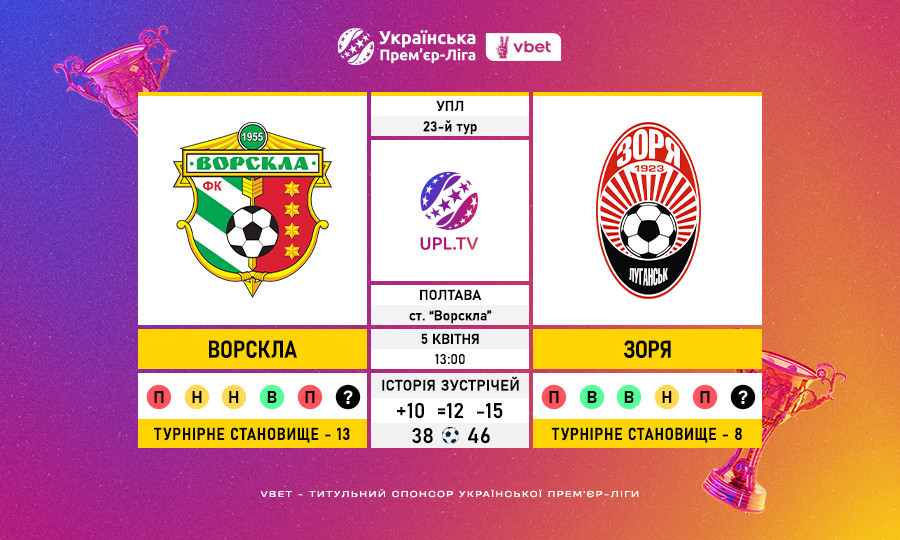 Матч 23-го туру VBET Української Прем’єр-Ліги «Ворскла» — «Зоря»: статистичне прев’ю