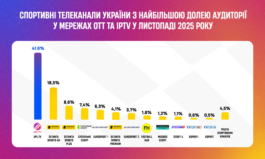 Within the sports segment, UPL.TV continued to not only maintain but expand its leadership. While the channel accounted for nearly 40% of all sports television viewership in OTT and IPTV in October, that figure rose to 41.6% in November.