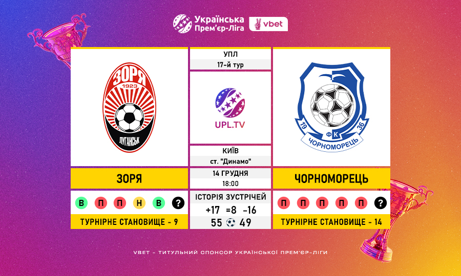 Матч 17-го туру VBET Української Прем’єр-Ліги «Зоря» — «Чорноморець»: статистичне прев’ю