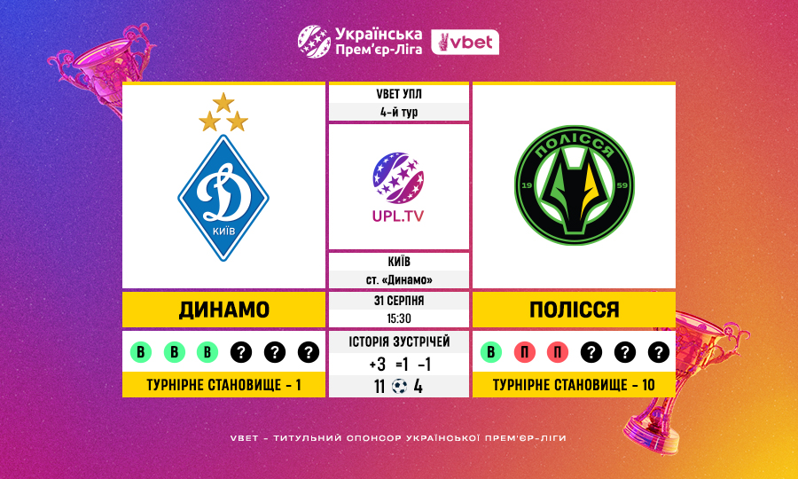 Матч 4-го туру VBET Української Прем’єр-Ліги «Динамо» — «Полісся»: статистичне прев’ю
