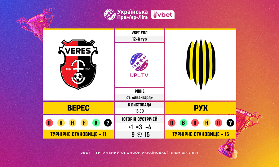 Матч 12-го туру VBET Української Прем’єр-Ліги «Верес» — «Рух»: статистичне прев’ю