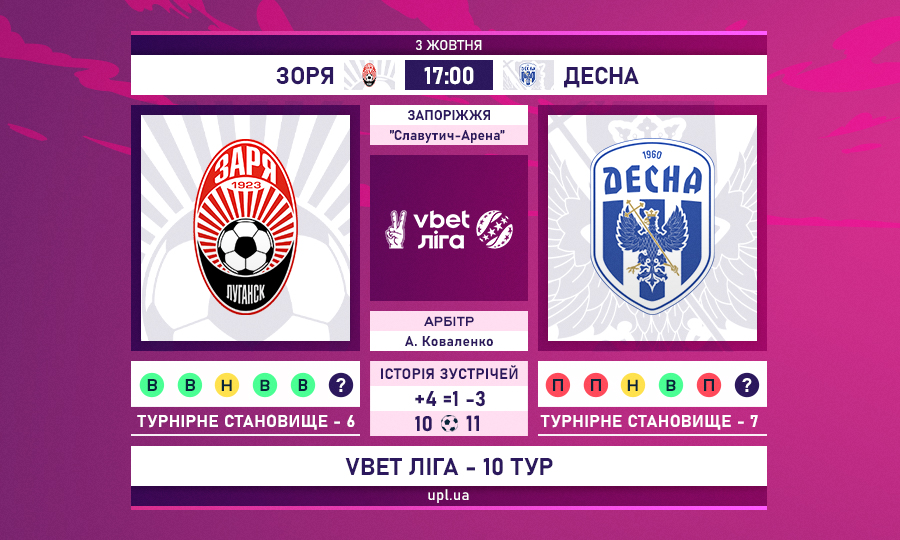 Матч 10-го туру VBET Ліги «Зоря» — «Десна»: статистичне прев’ю