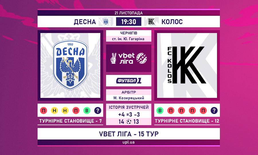 Матч 15-го туру VBET Ліги «Десна» — «Колос»: статистичне прев’ю