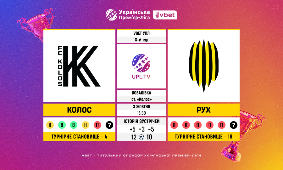 Матч 8-го туру VBET Української Прем’єр-Ліги «Колос» — «Рух»: статистичне прев’ю