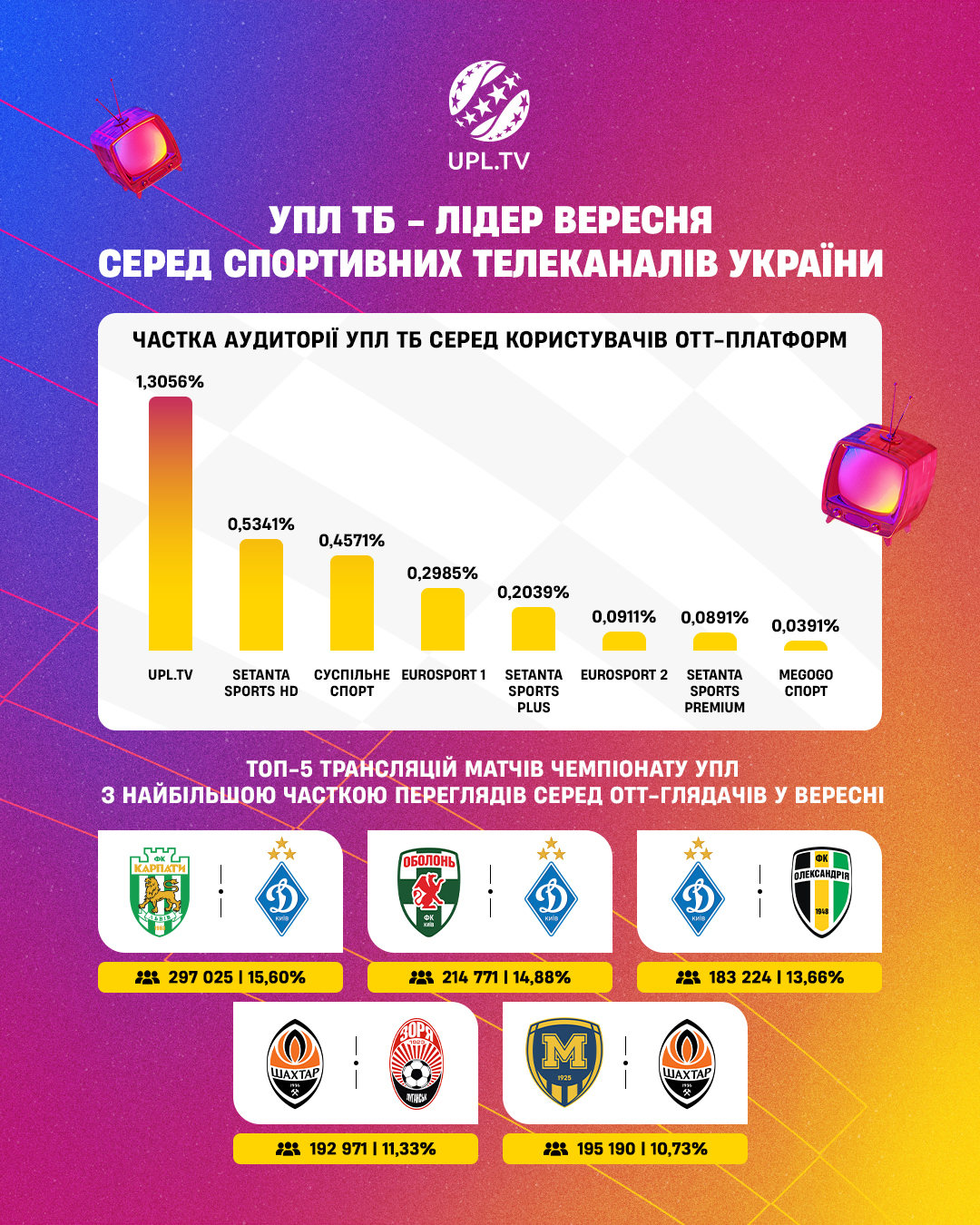 Згідно аналітики Big Data UA, частка аудиторії УПЛ.ТБ у вересні склала 1,31% — майже втричі більше, ніж у найближчих переслідувачів.