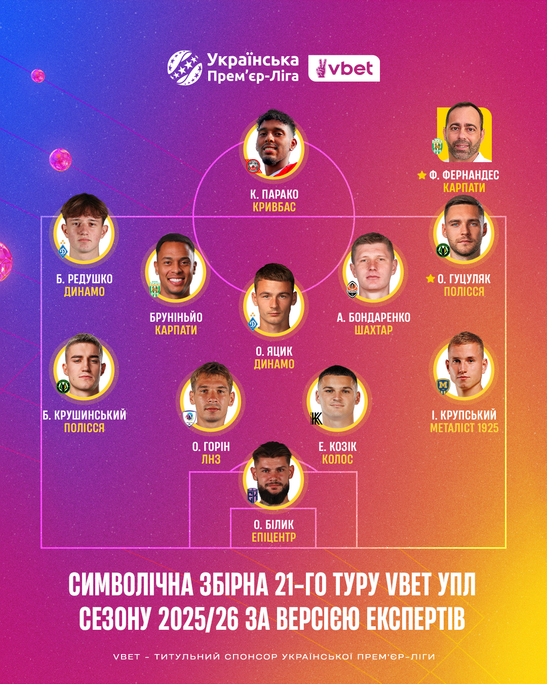 Українська Прем’єр-Ліга продовжує відзначати героїв сезону 2025/26 і після того, як відбувся перенесений матч «Зоря» — «Шахтар», склала символічну збірну 21-го туру Чемпіонату УПЛ, а також назвала найкращого футболіста та найкращого тренера 21-го туру. Традиційно це було зроблено разом з ведучими, експертами, коментаторами УПЛ.ТБ та представниками провідних спортивних ЗМІ України. Цього разу їх вийшло 33.