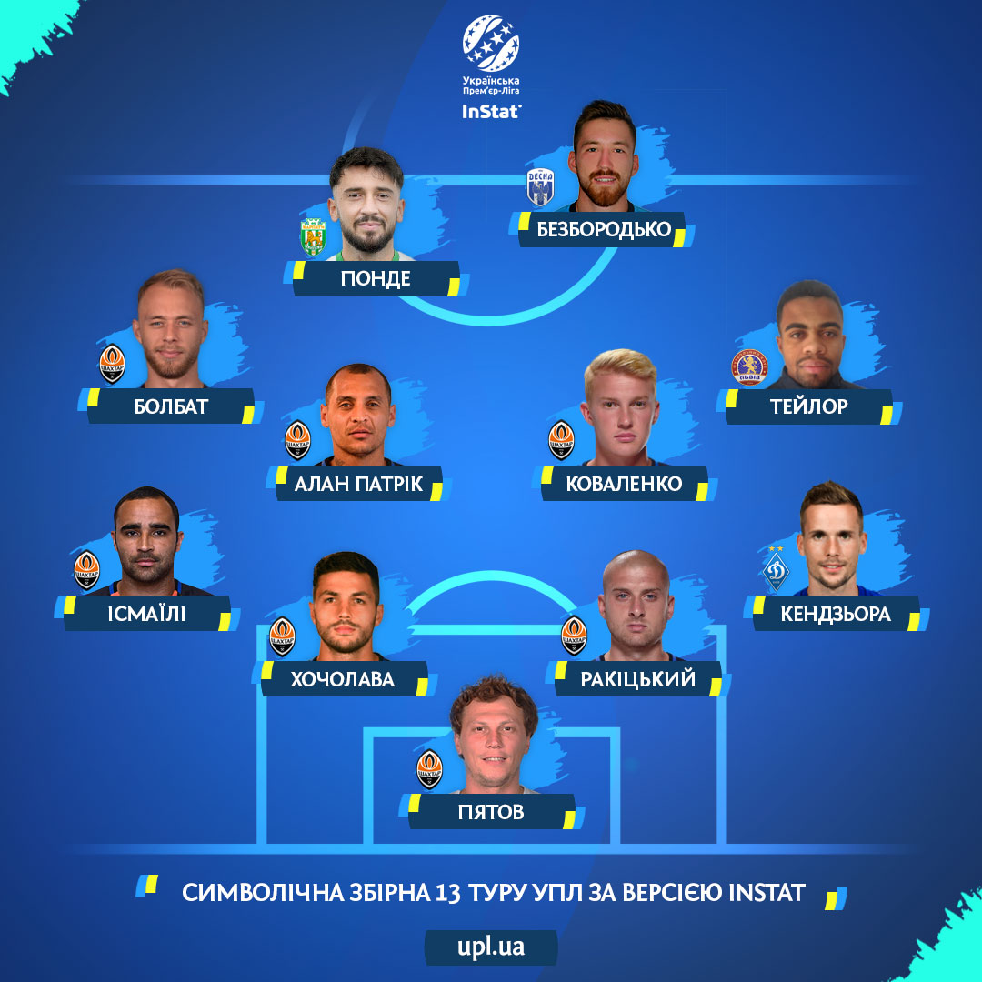 На основі оцінок InStat ми склали символічну збірну найкращих футболістів за підсумком 13 туру Чемпіонату УПЛ. Нагадаємо, що серед маси цифр цієї системи є списки топ-гравців за амплуа. Футболісти, які очолюють відповідні реєстри, входять у віртуальну 11-ку.
