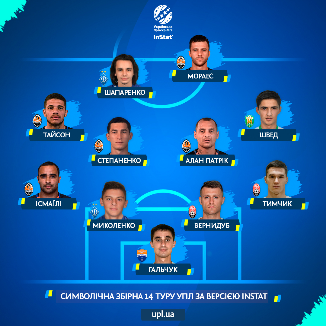 На основі оцінок InStat ми склали символічну збірну найкращих футболістів за підсумком 14 туру Чемпіонату УПЛ. Нагадаємо, що серед маси цифр цієї системи є списки топ-гравців за амплуа. Футболісти, які очолюють відповідні реєстри, входять у віртуальну 11-ку.